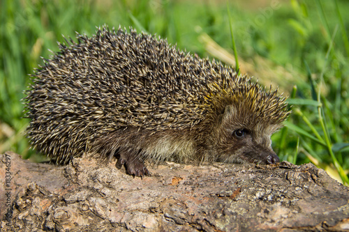 Young prickly hedgehog on the log