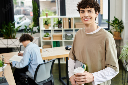 Young professional thrives in dynamic office environment while enjoying a warm beverage