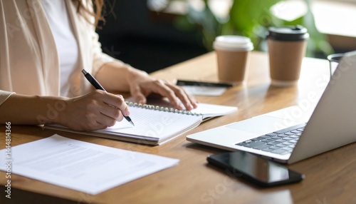 Young professional woman drafting blog post with laptop and coffee on wooden desk