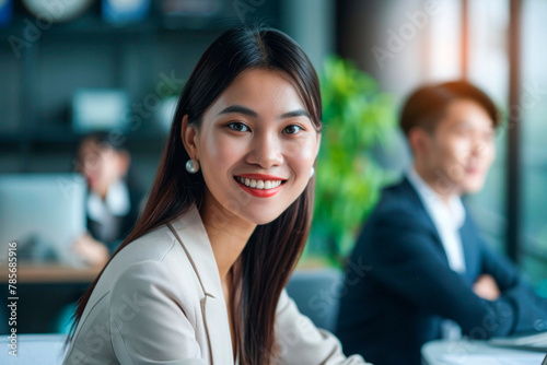 Young Professional Woman Smiling During Corporate Meeting in Modern Office Setting