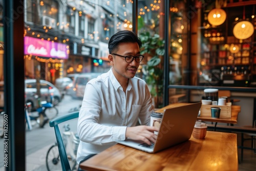 Young professional working intently on a laptop in a cafe with urban street views. Asian businessman in a white shirt engaged with his laptop at a busy coffee shop.