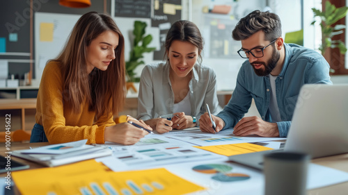 Young professionals collaborating on strategic business analysis in a modern office setting, showcasing teamwork and innovation