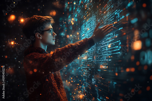 Young Programmer Interacting with Futuristic Digital Interface: A Journey into the Technological Frontier