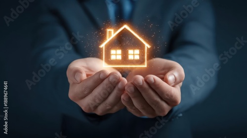 Young Real Estate Agent Holding Illuminated House Symbol in Hands for Representation of Property and Investment Opportunities