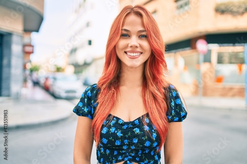 Young redhead girl smiling happy walking at street of city.