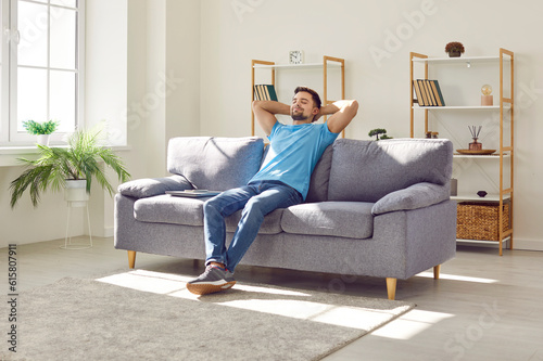 Young relaxed man sitting on comfortable couch in the living room at modern home and having a rest from a work with closed eyes. Calm peaceful guy enjoying quiet time alone in the room and dreaming.