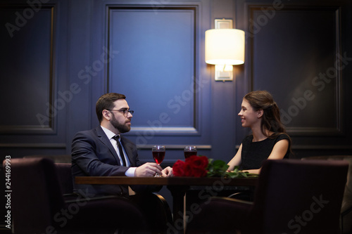 Young romantic dates sitting by table opposite one another while enjoying talk by dinner in restaurant