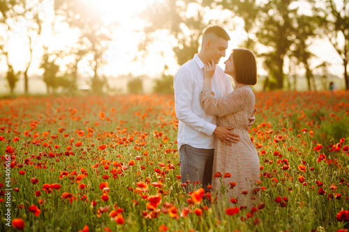 Young romantic loving married couple is standing among the red poppy flowers on the field on the beautiful sunset. Attractive boy and tender girl hug and kiss feeling happy. Love, family concept.