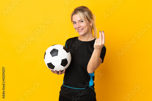 Young Russian football player woman isolated on yellow background making money gesture