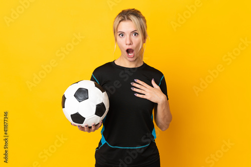 Young Russian football player woman isolated on yellow background surprised and shocked while looking right