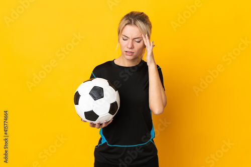 Young Russian football player woman isolated on yellow background with headache