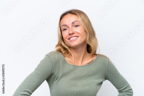 Young Russian woman isolated on white background posing with arms at hip and smiling