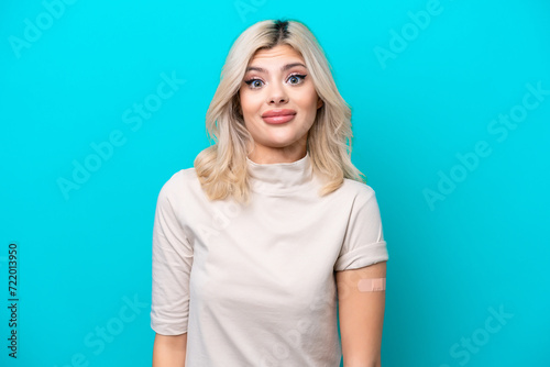 Young Russian woman wearing band aid isolated on blue background with surprise and shocked facial expression