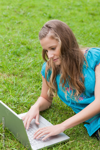 Young serious girl lying on the grass while using her laptop