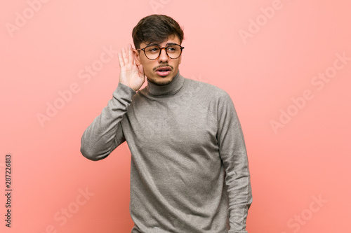 Young smart student man trying to listening a gossip.