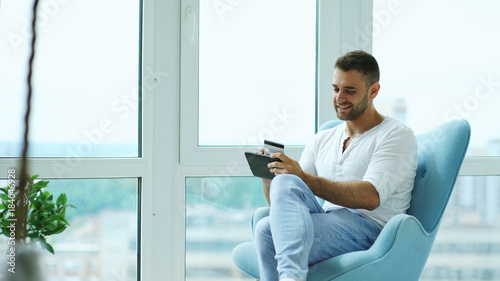 Young smiling man doing online shopping using digital tablet computer sitting at balcony in modern loft apartment