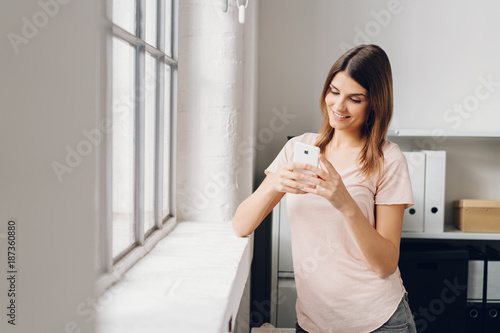 Young smiling woman standing by window with phone