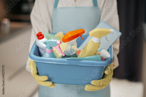 Young smiling woman with a basin with cleansing appliances