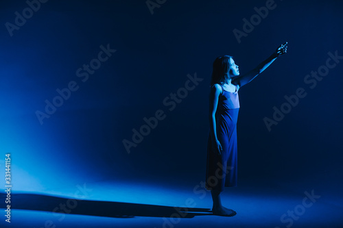 Young stylish girl dancing in the Studio on a colored neon background. Classic dancer.
