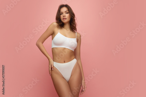 Young tall thin girl with long soft brown hair wearing white inner wear posing over pink color background. Concept of natural beauty, body and skin care, healthy eating