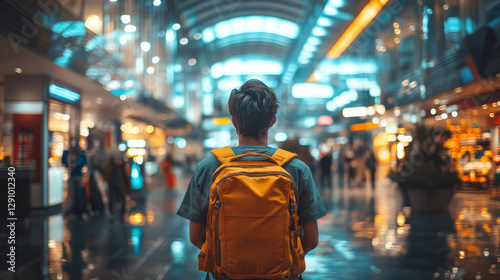 Young Traveler Exploring a Busy Airport Terminal During the Day