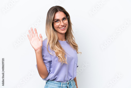 Young Uruguayan woman isolated on white background saluting with hand with happy expression