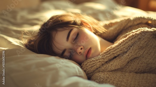 Young Woman Asleep in Bed Wrapped in Knitted Blanket