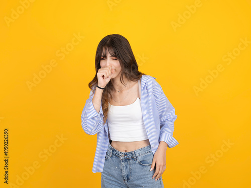 Young woman covering mouth while coughing, wearing striped shirt and denim, standing against bright yellow studio background with wide copy space. Illness and respiratory health concept.