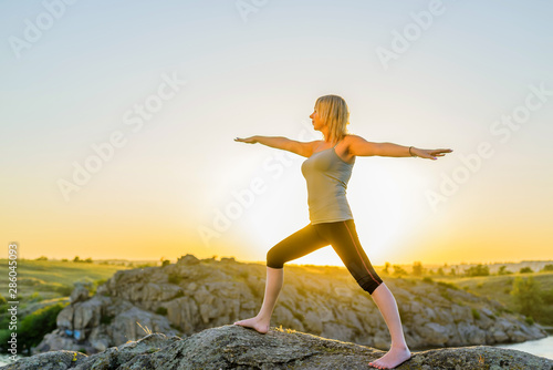 Young woman doing yoga on top of a mountain at sunset, free space.