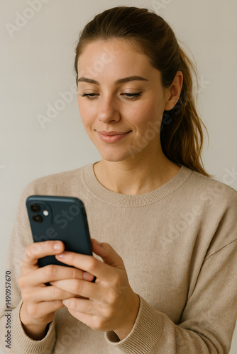 Young woman focused on her smartphone in a neutral-toned room during daytime