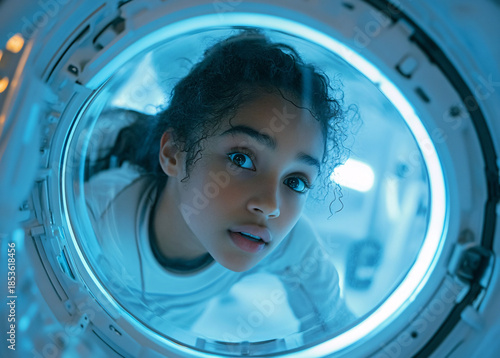 Young woman gazes into the camera from a portal, eyes full of wonder.