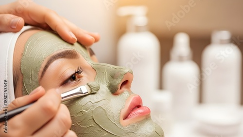 Young woman getting green clay mud mask applied for deep pore cleansing beauty treatment