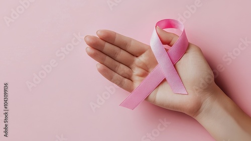 Young woman hand hold pink Ribbon and wear shirt for support people life and illness. National cancer survivors month, Mother and World cancer day concept,Pink October Breast Cancer Awareness month.