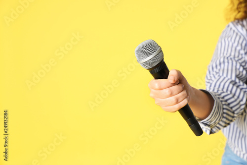Young woman holding microphone in hand on color background. Space for text