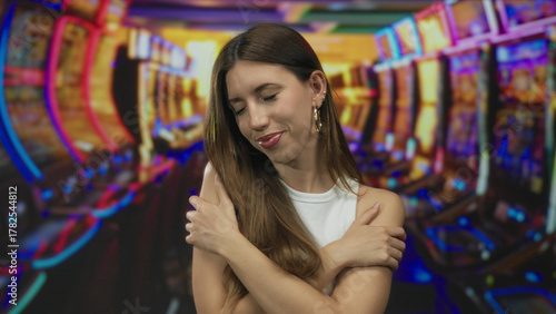 Young woman hugging herself at a colorful slot machine aisle in casino building; self care comfort serenity.