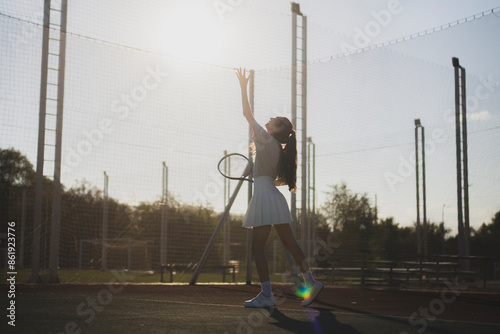 young woman in a white tennis outfit stands on a tennis court, preparing to serve the ball. The sun shines brightly behind her, creating a beautiful silhouette