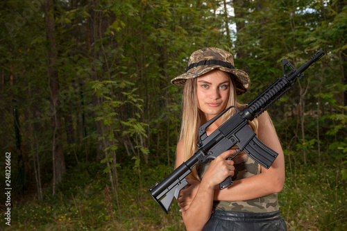 Young woman in boonie hat posing with gun in body camouflage and black leather shorts. Military style