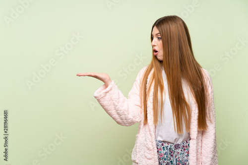 Young woman in dressing gown over green wall holding copyspace imaginary on the palm