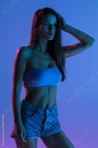 Young woman in short and top standing isolated on violet light