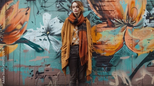 Young woman in stylish outfit standing against a vibrant graffiti wall in an urban setting