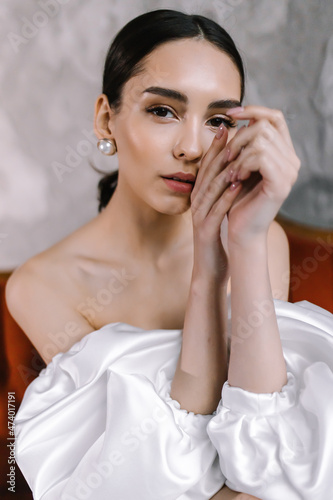 Young woman in white wedding dress Brunette model posing Portrait of a beautiful face