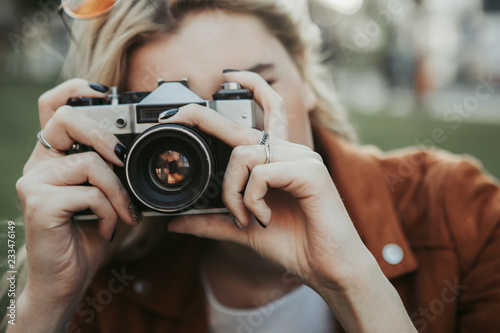 Young woman is holding snapshot-camera and making photo. Lady locating on blurred background