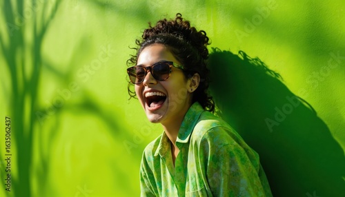 Young woman laughs outdoors, wearing sunglasses, green patterned blouse against vibrant neon green wall. Curly hair up. Textured background features tree shadows, creating playful, modern, stylish