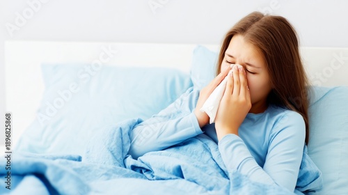 Young woman lying in bed blowing her nose into a tissue, suffering from a cold or flu with copy space