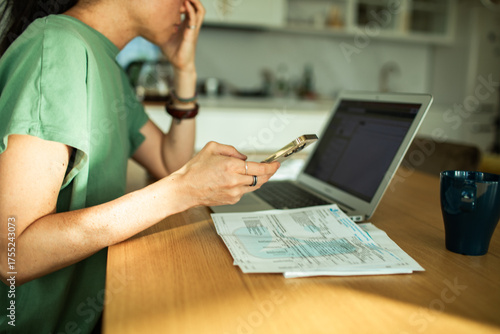 Young woman managing finances at home