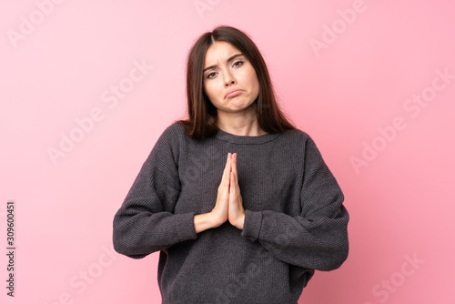 Young woman over isolated pink background keeps palm together. Person asks for something