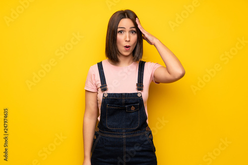Young woman over yellow wall has just realized something and has intending the solution