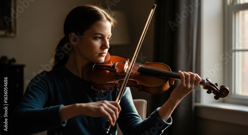 Young woman playing violin in sunlit room, focused expression