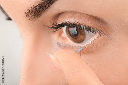 Young woman putting contact lens, closeup