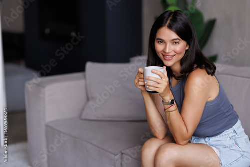 Young Woman relaxing at home drinking tea sitting on a couch at home